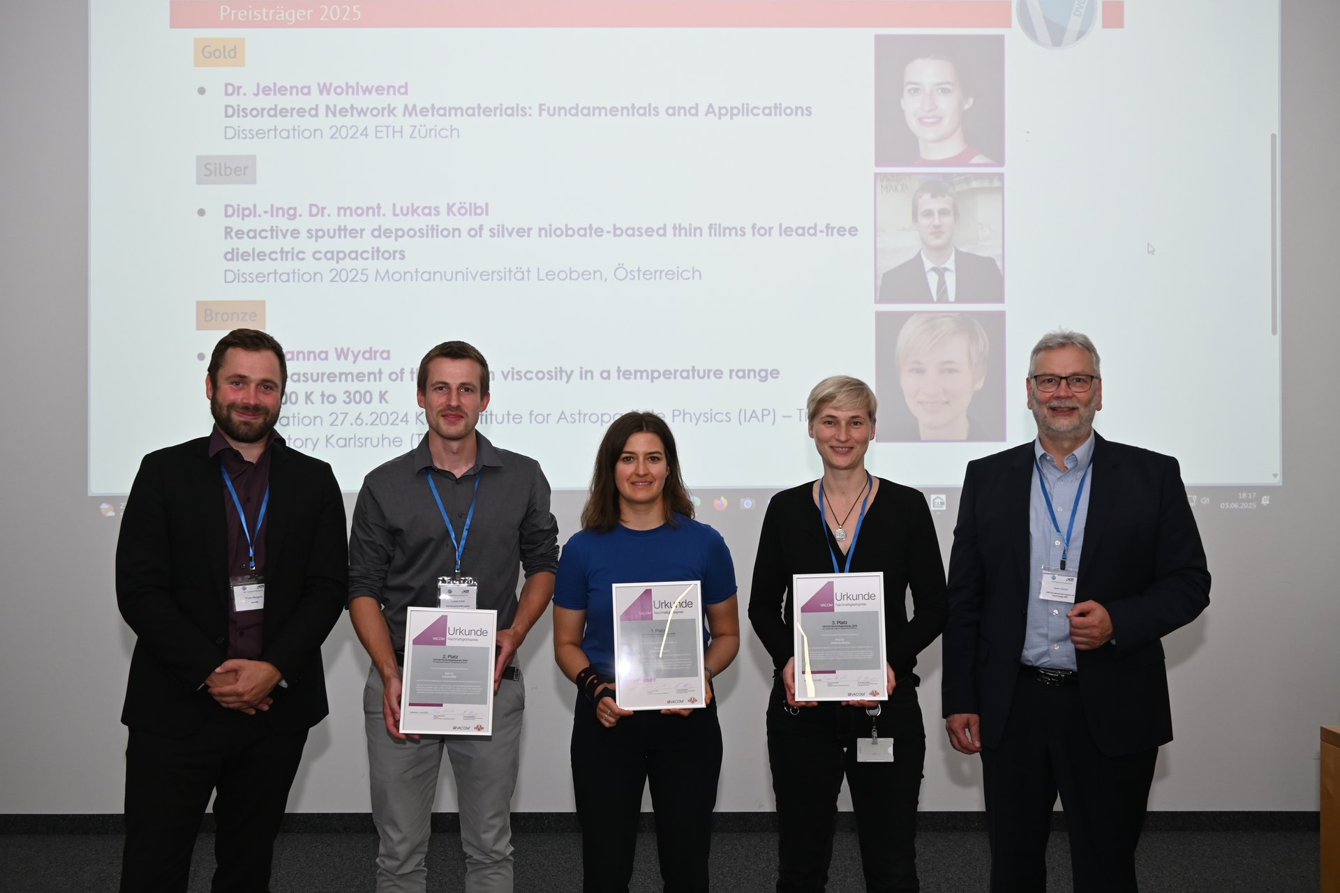 Lukas Kölbl vom Lehrstuhl für Funktionale Werkstoffe und Werkstoffsysteme wurde am 3. Juni 2025 für seine kürzlich abgeschlossene Doktorarbeit mit dem 2. Platz des VACOM Nachhaltigkeitspreises der Deutschen Vakuumgesellschaft ausgezeichnet. Dieser Preis wird seit dem Jahr 2022 für herausragende, die Prinzipien der Nachhaltigkeit berücksichtigende Abschlussarbeiten des wissenschaftlichen Nachwuchses auf dem Gebiet der Vakuumtechnik vergeben. Lukas Kölbl beschäftigte sich in seiner Doktorarbeit mit der Entwicklung umweltverträglicher, bleifreier dielektrischer Schichten auf der Basis des Silberniobats für dielektrische Dünnschichtkondensatoren für die Energiespeicherung. Der Preis wurde im Rahmen des Mitgliederkontakttages der Deutschen Vakuumgesellschaft am Karlsruher Institut für Technologie vergeben.